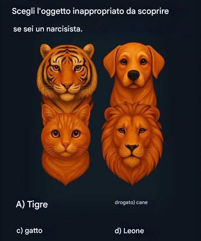 A prima vista, questo breve quiz sembra un semplice indovinello. Vengono mostrati quattro animali: una tigre, un cane, un gatto e un leone, e viene posta una semplice domanda: Quale non c'entra?