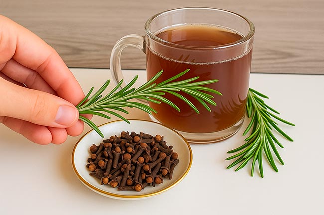Una potente miscela fatta in casa a base di chiodi di garofano, foglie di alloro e rosmarino. Se usata correttamente, questa combinazione aiuta a rallentare la caduta dei capelli e a favorirne la ricrescita.