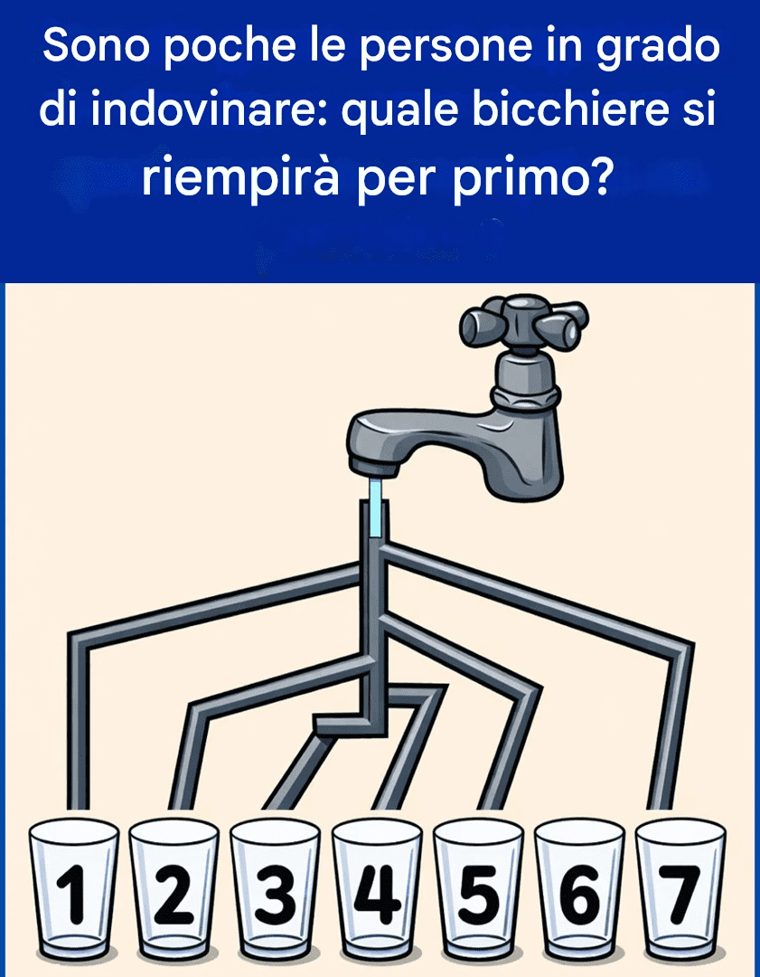 A prima vista, questa sfida sembra infantile. Sette bicchieri, qualche tubo, acqua che deve scorrere... e una semplice domanda: quale bicchiere verrà riempito per primo? Eppure, come spesso accade con i rompicapo visivi, la risposta non è quella che ci si aspetta. E se si risponde troppo in fretta, è probabile che si sia caduti nella trappola.