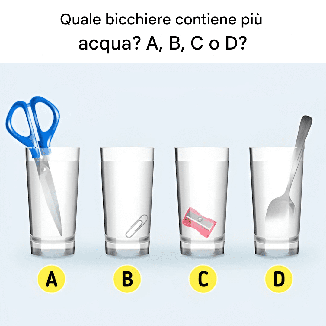 Quattro bicchieri d'acqua, quattro oggetti diversi: quale contiene più acqua? Questo intrigante rompicapo mette alla prova le tue capacità logiche e fisiche. Riesci a trovare la risposta giusta?