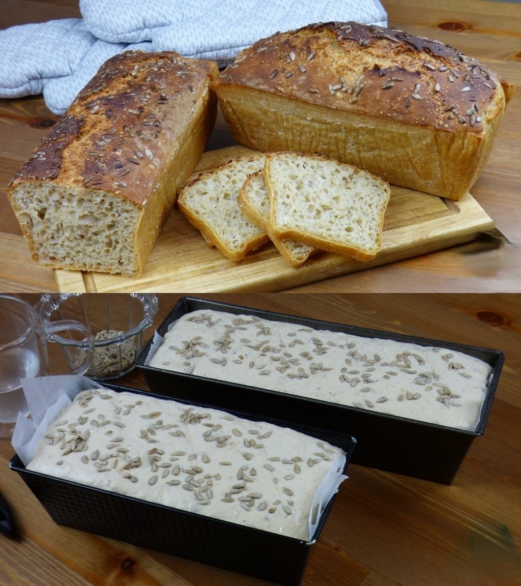 Preriscaldate il forno a circa 220 °C (420 °F). Spruzzate le pagnotte lievitate con acqua (io lo faccio a mano), incidetele diagonalmente con un coltello affilato e (facoltativamente) cospargetele di semi – io ho usato semi di girasole, poi cospargetele di nuovo con acqua.