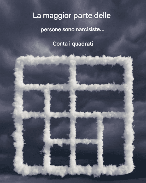 Online circola un piccolo rompicapo che raffigura semplicemente un contorno a forma di nuvola con una griglia di quadrati. Spesso è accompagnato da un'affermazione drammatica come "La maggior parte delle persone sono narcisiste", seguita dalla sfida: "Quanti quadrati vedi?"