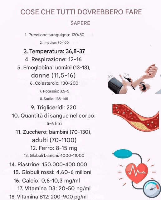 Conoscere determinati valori di riferimento per il corpo umano è essenziale per interpretare i test clinici di base e rilevare tempestivamente potenziali disturbi. Sebbene il consulto con un medico sia sempre necessario per una diagnosi accurata, una conoscenza generale può aiutare a prendere decisioni più consapevoli sul proprio benessere. Di seguito, presentiamo i parametri più importanti e i loro intervalli di normalità approssimativi.